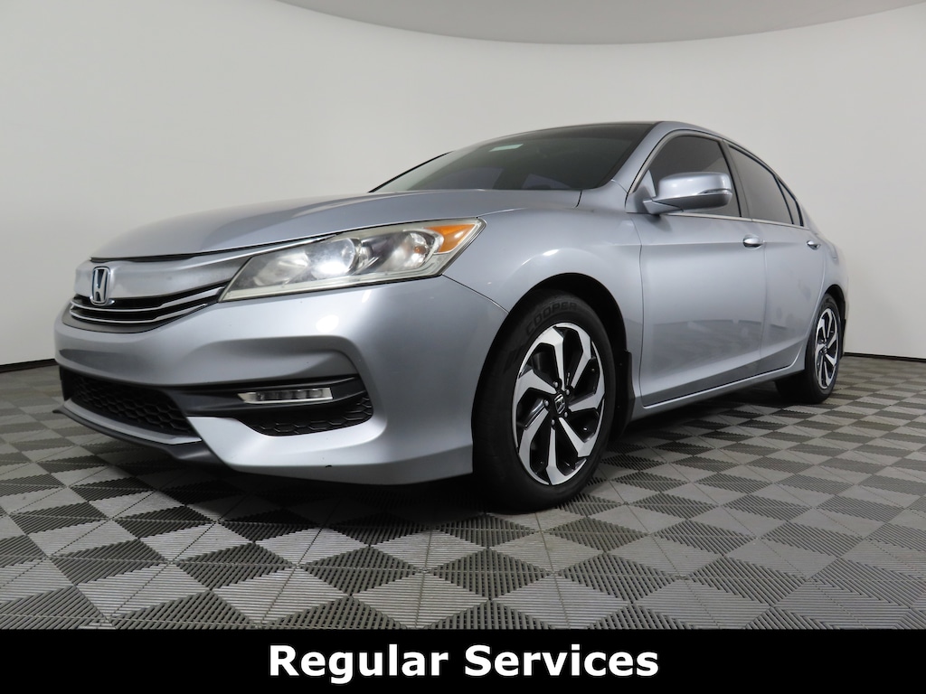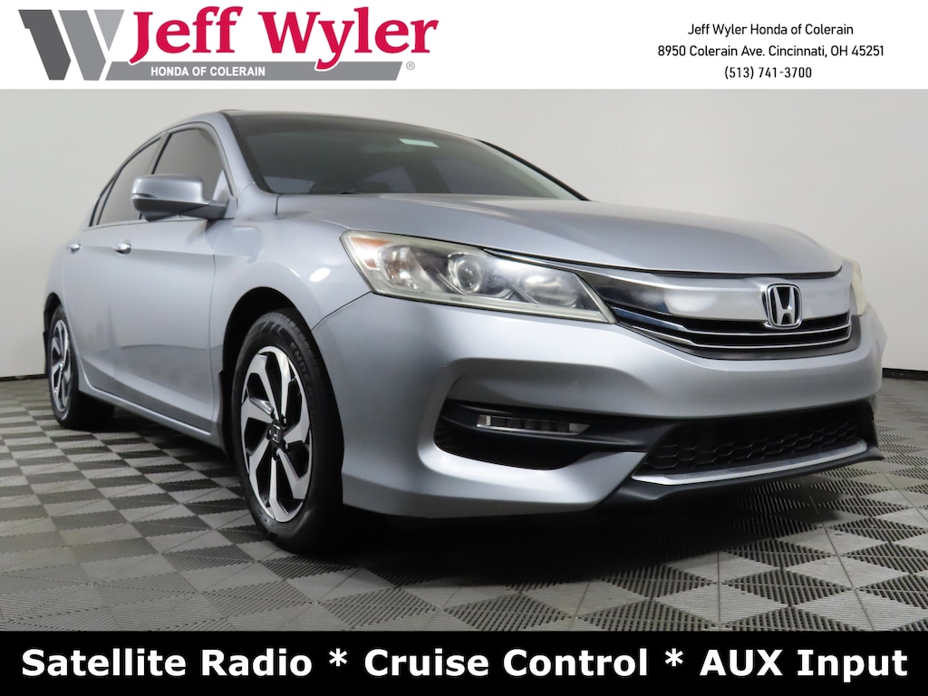 Jeff Wyler Honda of Colerain is proud to offer this wonderful-looking 2016 Honda Accord EX in Lunar Silver Metallic. Well equipped with: 160-Watt AM/FM/CD Audio System, 17" Alloy Wheels, 4-Wheel Disc Brakes, 6 Speakers, ABS brakes, Air Conditioning, Alloy wheels, AM/FM radio: SiriusXM, Apple CarPlay/Android Auto, Automatic temperature control, Brake assist, Bumpers: body-color, CD player, Cloth Seat Trim, Delay-off headlights, Driver door bin, Driver vanity mirror, Dual front impact airbags, Dual front side impact airbags, Electronic Stability Control, Emergency communication system, Exterior Parking Camera Rear, Four wheel independent suspension, Front anti-roll bar, Front Bucket Seats, Front Center Armrest, Front dual zone A/C, Front fog lights, Front reading lights, Fully automatic headlights, Garage door transmitter, Heated door mirrors, Illuminated entry, Leather Shift Knob, Low tire pressure warning, Occupant sensing airbag, Outside temperature display, Overhead airbag, Overhead console, Panic alarm, Passenger door bin, Passenger vanity mirror, Power door mirrors, Power driver seat, Power moonroof, Power steering, Power windows, Radio data system, Rear anti-roll bar, Rear seat center armrest, Rear window defroster, Remote keyless entry, Security system, Speed control, Speed-sensing steering, Speed-Sensitive Wipers, Split folding rear seat, Steering wheel mounted audio controls, Tachometer, Telescoping steering wheel, Tilt steering wheel, Traction control, Trip computer, Turn signal indicator mirrors, and Variably intermittent wipers.
