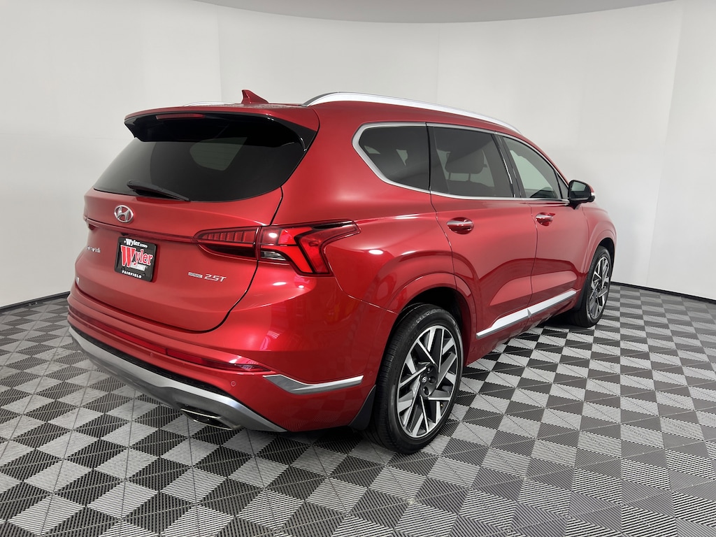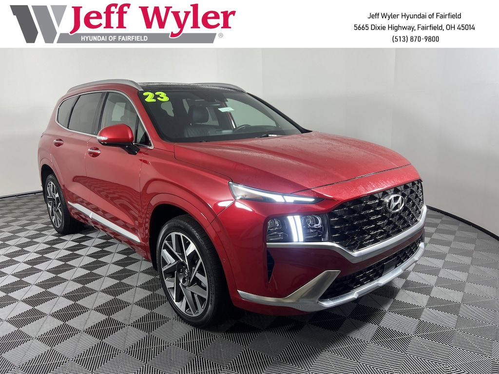CARFAX One-Owner. Clean CARFAX. Jeff Wyler Hyundai of Fairfield is proud to offer this gorgeous-looking 2023 Hyundai Santa Fe Calligraphy in Calypso Red. Well equipped with: Option Group 01, Hyundai Certified Used Vehicles Certified, Black Leather, Android Auto, Apple CarPlay, CALL NOW FOR YOUR VIP APPOINTMENT 513-870-9800, FULLY SERVICED w/RECORDS, GUARANTEED FINANCING!! NO MATTER YOUR SITUATION WE CAN GET AN APPROVAL!!, THE #1 Volume dealer in the region! Come see why for yourself Today!!, WE PAY MORE FOR YOUR TRADE!!, 12 Speakers, 4-Wheel Disc Brakes, ABS brakes, Air Conditioning, All Season Fitted Liners, Alloy wheels, AM/FM radio: SiriusXM, Apple CarPlay & Android Auto, Auto High-beam Headlights, Auto-dimming Rear-View mirror, Automatic temperature control, Axle Ratio: 3.316, Brake assist, Bumper Applique, Bumpers: body-color, Cargo Net, Cargo Tray, Delay-off headlights, Driver door bin, Driver vanity mirror, Dual front impact airbags, Dual front side impact airbags, Electronic Stability Control, Emergency communication system, Exterior Parking Camera Rear, Four wheel independent suspension, Front anti-roll bar, Front Bucket Seats, Front Center Armrest, Front dual zone A/C, Front reading lights, Fully automatic headlights, Garage door transmitter: HomeLink, harman/kardon® Speakers, Heads-Up Display, Heated & Ventilated Front Bucket Seats, Heated door mirrors, Heated front seats, Heated rear seats, Heated steering wheel, Illuminated entry, Leather steering wheel, Low tire pressure warning, Memory seat, Mudguards, Navigation System, Occupant sensing airbag, Outside temperature display, Overhead airbag, Overhead console, Panic alarm, Passenger door bin, Passenger vanity mirror, Power door mirrors, Power driver seat, Power Liftgate, Power moonroof, Power passenger seat, Power steering, Power windows, Quilted Premium Nappa Leather Seat Trim, Radio: AM/FM Harman Kardon Display Audio, Rain sensing wipers, Rear anti-roll bar, Rear seat center armrest, Rear window defroster, Rear window wiper, Remote keyless entry, Security system, Speed control, Speed-sensing steering, Split folding rear seat, Spoiler, Steering wheel mounted audio controls, Tachometer, Telescoping steering wheel, Tilt steering wheel, Traction control, Trip computer, Turn signal indicator mirrors, Variably intermittent wipers, Ventilated front seats, and Wheels: 20" x 8.0J Alloy. Certified. Hyundai Certified Used Vehicles Details: * Powertrain Limited Warranty: 120 Month/100,000 Mile (whichever comes first) from original in-service date * Roadside Assistance * Warranty Deductible: $50 * 173+ Point Inspection * Vehicle History * Limited Warranty: 60 Month/60,000 Mile (whichever comes first) from original in-service date * Includes 10-year/Unlimited Mileage Roadside Assistance with Rental Car and Trip Interruption Reimbursement; Please See Dealers for Specific Vehicle Eligibility Requirements. 10-Year/100,000 Mile Hybrid/EV Battery Warranty. 3-Months SiriusXM Trial Subscription. Complimentary 1 Year (Connected Care & Remote Pkgs).TO CHECK ON THE AVAILABILITY OF THIS VEHICLE REACH OUT TO ONE OF OUR TEAM MEMBERS!! ALSO SHOP ONLINE AT https://www.jeffwylerhyundaioffairfield.com/ Proudly Serving: Cincinnati, Dayton, Columbus, Louisville, Lexington, Indianapolis, Hamilton, Florence, Alexandria, Beavercreek, Springdale, West Chester, Monroe, Fairfield, Kenwood, Newport and all of greater Cincinnati Ohio, Indiana, and Northern Kentucky.