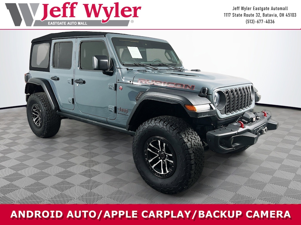 Jeff Wyler Eastgate Auto Mall is pumped up to offer this attractive 2024 Jeep Wrangler Rubicon in Anvil Clear Coat. Well equipped with: Capability Package (Steel Front Bumper, Steel Rear Bumper, and Warn Winch), Convenience Group (Heated Front Seats, Heated Steering Wheel, and Remote Start System), Quick Order Package 24R Rubicon, Xtreme 35" Tire Package (35" Tire Suspension, 97 MPH Vehicle Max Speed Calibration, Anti-Lock 4-Wheel Disc Perf Brakes, MOPAR Hinge-Gate Reinforcement, Wheel Flare Extensions, and Wheels: 17" x 8" Machined w/Black Pockets), 12.3" Touchscreen Display, 4-Wheel Disc Brakes, 8 Speakers, ABS brakes, Air Conditioning, Alloy wheels, AM/FM radio: SiriusXM, Apple CarPlay, Apple CarPlay/Android Auto, Automatic temperature control, Aux Battery, Brake assist, Cloth Low-Back Bucket Seats, Compass, Connectivity - US/Canada, Delay-off headlights, Disassociated Touchscreen Display, Driver door bin, Driver vanity mirror, Dual front impact airbags, Dual front side impact airbags, Electronic Stability Control, Emergency communication system: Jeep Connect, Front anti-roll bar, Front Bucket Seats, Front Center Armrest w/Storage, Front dual zone A/C, Front fog lights, Front License Plate Bracket, Front reading lights, Fully automatic headlights, Google Android Auto, Heated door mirrors, Illuminated entry, Integrated Center Stack Radio, Integrated roll-over protection, Integrated Voice Command w/Bluetooth, Low tire pressure warning, MOPAR All-Weather Floor Mats, Non-Lock Fuel Cap w/o Discriminator, Occupant sensing airbag, Outside temperature display, Overhead airbag, Panic alarm, ParkView Rear Back-Up Camera, Passenger door bin, Passenger vanity mirror, Performance Suspension, Power door mirrors, Power steering, Power windows, Radio data system, Radio: Uconnect 5 w/12.3" Display, Rear anti-roll bar, Rear reading lights, Remote keyless entry, Security system, Speed control, Split folding rear seat, Steering wheel mounted audio controls, Stop-Start Dual Battery System, Tachometer, Telescoping steering wheel, Tilt steering wheel, Traction control, Trip computer, Variably intermittent wipers, Voltmeter, and Wheels: 17" x 7.5" Machined/Painted Black. CARFAX One-Owner. Clean CARFAX. Certified. Ask about available certifications. Used vehicles 10 years of age or newer with less than 100,000 miles are eligible for the Wyler Assurance Program, but eligible vehicles must pass our reconditioning process and multi-point inspection. Provided the vehicle passes inspection, vehicles will be eligible for the 6 month/6,000 mile limited warranty. The 6 month/6,000 mile limited warranty is NOT available on AS-IS vehicles, wholesale vehicles, lease buyback/pass-thru vehicles or un-inspected vehicles. Note that this program can also apply to vehicles where the remaining factory coverage is less than 6 months or 6,000 miles. Please check the Federal Trade Commission (FTC) Buyers guide on the vehicle for full details as to whether or not warranty coverage may apply. Contact Dealer for additional details. The Wyler Assurance 6 month/6,000 Mile limited warranty ends 6 months from the date of the Retail Purchase Agreement (BUYERS ORDER) or when the vehicle's odometer registers 6,000 additional miles to the mileage listed on the BUYERS ORDER, whichever comes first. Your Deductible - The warranty holder on your contract pays the first $100 of each covered repair.