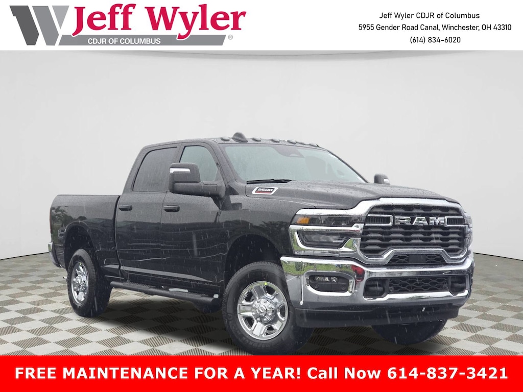 Jeff Wyler Columbus Auto Mall is pleased to offer this good-looking 2025 Ram 2500 Tradesman in Diamond Black Crystal Pearlcoat. Well equipped with: Quick Order Package 2UA Tradesman, Tradesman Level 2 Equipment Group (115V Auxiliary Front Power Outlet, 12" Touchscreen Display, 2 Way Rear Headrest Seat, 4 Way Front Headrests, 40/20/40 Split Bench Seat, 400W Inverter, 4G LTE Wi-Fi Hot Spot, Air Conditioning ATC w/Dual Zone Control, Alexa Built-In, Anti-Spin Differential Rear Axle, Apple CarPlay, Auto-Dimming Rear-View Mirror, Black Exterior Mirrors, Bright Front Bumper, Bright Rear Bumper, Carpet Floor Covering, Center Hub, Chrome Grille Surround, Cloth 40/20/40 Bench Seat, Connected Travel & Traffic Services, Connectivity - US/Canada, Disassociated Touchscreen Display, Emergency Vehicle Alert System (EVAS), Exterior 115V AC Outlet, Exterior Mirrors Courtesy Lamps, Exterior Mirrors w/Heating Element, Exterior Mirrors w/Supplemental Signals, Front & Rear Floor Mats, Front Armrest w/Cupholders, Global Telematics Box Module (TBM), Google Android Auto, GPS Antenna Input, GPS Navigation, HD Radio, Integrated Voice Command w/Bluetooth, Manual Adjust 4-Way Driver Seat, Manual Adjust 4-Way Front Passenger Seat, Manual Folding Exterior Mirrors, Manual Telescoping Mirrors, Matte Black Mesh Grille w/Chrome, Mirror Running Lights, Mopar Black Tubular Side Steps, Off-Road Info Pages, ParkSense Front/Rear Park Assist System, Power Adjust Mirrors, Power Adjustable Convex Aux Mirrors, Power Heated Folding Telescope Mirrors, Radio: Uconnect 5 Nav w/12.0" Display, Rear Folding Seat, Rear Power Sliding Window, Remote USB Port - Charge Only, Selectable Tire Fill Alert, SiriusXM Radio Service, SiriusXM w/360L, Storage Tray, Tinted Acoustic Windshield Glass, Trailer Tow Pages, and Wheels: 18" x 8.0" Steel Chrome Clad), 3.73 Axle Ratio, 4-Wheel Disc Brakes, 6 Speakers, ABS brakes, Air Conditioning, AM/FM radio: SiriusXM, Apple CarPlay/Android Auto, Black Wheel Center Hub, Brake assist, Clearance Lamps, Compass, Delay-off headlights, Driver door bin, Dual front impact airbags, Dual front side impact airbags, Electronic Stability Control, Front anti-roll bar, Front Center Armrest w/Storage, Front fog lights, Front License Plate Bracket, Front reading lights, Fully automatic headlights, Heavy Duty Vinyl 40/20/40 Split Bench Seat, Illuminated entry, Low tire pressure warning, Occupant sensing airbag, Outside temperature display, Overhead airbag, Overhead console, Panic alarm, ParkView Rear Back-Up Camera, Passenger door bin, Passenger vanity mirror, Power steering, Power windows, Radio data system, Radio: Uconnect 5 w/8.4" Display, Rear anti-roll bar, Rear step bumper, Rear window defroster, Remote keyless entry, Speed control, Tachometer, Tilt steering wheel, Traction control, Variably intermittent wipers, Voltmeter, and Wheels: 17" x 7.5" Black Steel Styled.Wyler Family First Package Includes: NanoCure Appearance Protection: Exterior & Interior Chemical Sealant Applied to Protect Against Environmental Hazards (7 Year Warranty Coverage). Pulse- Rear End Collision Avoidance System Theft Deterrent Strategy gives you 5 Years of Coverage against vehicle theft, Offering up to a $5,000 benefit. Price does not include Tax, Title, License and Documentary Fee$1000 - Driveability / Automobility Program. Exp. 01/05/2026 $500 - 2025 National 2025 Military Bonus Cash. Exp. 01/05/2026