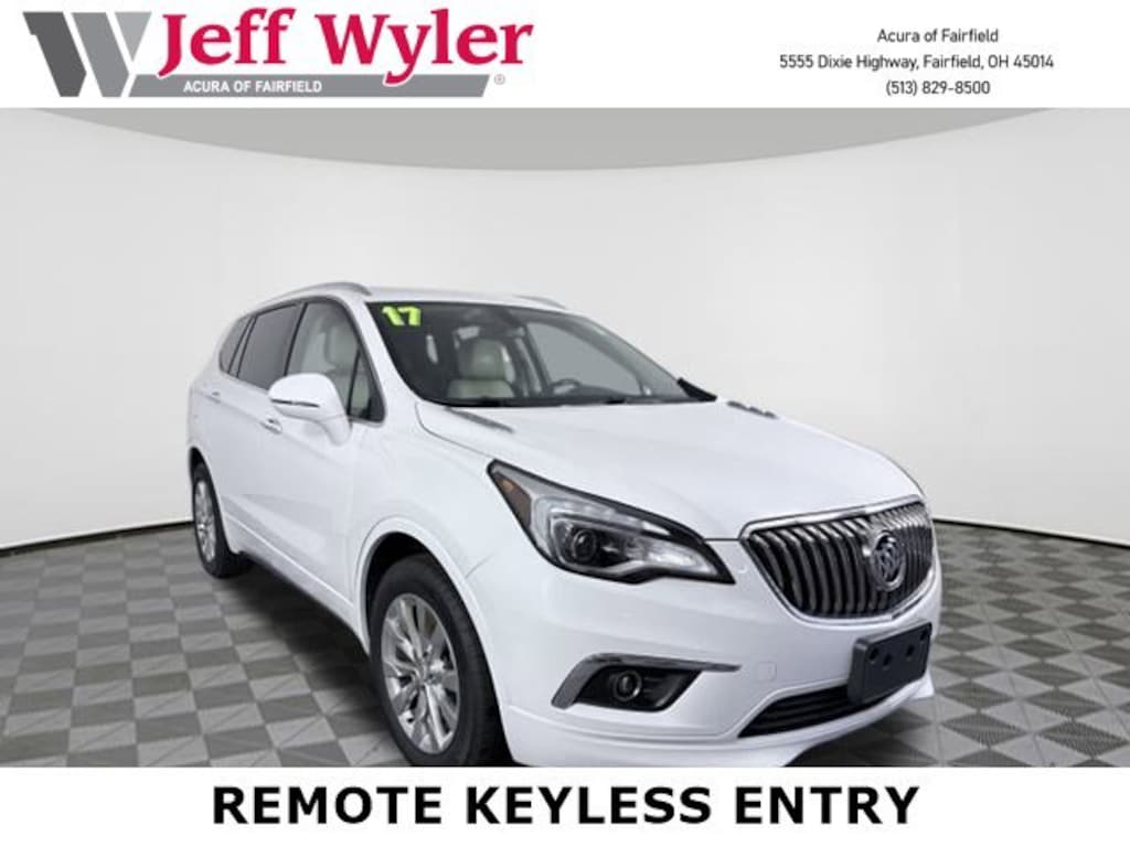 Jeff Wyler Acura of Fairfield is pumped up to offer this superb 2017 Buick Envision Essence in Summit White. Buick Interior Protection Package (LPO) (All-Weather Cargo Mat (LPO) and All-Weather Floor Mats), Preferred Equipment Group 1SL, 18" 10-Spoke Polished Aluminum Wheels, 3.50 Final Drive Axle Ratio, 4-Wheel Disc Brakes, 6 Speakers, 6-Speaker Audio System Feature, ABS brakes, Air Conditioning, Alloy wheels, AM/FM radio: SiriusXM, Apple CarPlay/Android Auto, Auto-dimming door mirrors, Auto-dimming Rear-View mirror, Automatic temperature control, Brake assist, Bumpers: body-color, Compass, Delay-off headlights, Driver 8-Way Power Seat Adjuster, Driver door bin, Driver vanity mirror, Dual front impact airbags, Dual front side impact airbags, Electronic Stability Control, Emergency communication system: OnStar Guidance, Exterior Parking Camera Rear, Four wheel independent suspension, Front anti-roll bar, Front Bucket Seats, Front Center Armrest, Front dual zone A/C, Front fog lights, Front Passenger 8-Way Power Seat Adjuster, Front reading lights, Fully automatic headlights, Garage door transmitter, Heated door mirrors, Heated Driver & Front Passenger Seats, Heated front seats, Heated rear seats, Heated steering wheel, Illuminated entry, Knee airbag, Low tire pressure warning, Memory seat, Occupant sensing airbag, Outside temperature display, Overhead airbag, Overhead console, Panic alarm, Passenger door bin, Passenger vanity mirror, Perforated Leather-Appointed Seat Trim, Power door mirrors, Power driver seat, Power Liftgate, Power Panoramic Tilt-Sliding Moonroof, Power passenger seat, Power steering, Power windows, Premium audio system: IntelliLink, Radio data system, Radio: Buick IntelliLink AM/FM Stereo, Rear air conditioning, Rear anti-roll bar, Rear Parking Sensors, Rear reading lights, Rear seat center armrest, Rear side impact airbag, Rear window defroster, Rear window wiper, Remote keyless entry, Roof rack: rails only, Security system, SiriusXM Satellite Radio, Speed control, Speed-sensing steering, Split folding rear seat, Spoiler, Steering wheel mounted audio controls, Tachometer, Telescoping steering wheel, Tilt steering wheel, Traction control, Trip computer, Turn signal indicator mirrors, and Variably intermittent wipers ***ONLINE PRICE DOES NOT INCLUDE WYLER FAMILY FIRST PACKAGE*** Odometer is 13999 miles below market average! Priced below KBB Fair Purchase Price!Reviews: * Manageable size makes it easy to drive and maneuver; the cabin is as quiet inside as premium luxury SUVs; you get a lot of features for the money. Source: EdmundsAwards: * 2017 IIHS Top Safety Pick+ with optional front crash prevention * 2017 IIHS Top Safety Pick+ with optional front crash prevention and specific headlights * 2017 KBB.com Brand Image AwardsProudly Serving: Cincinnati, Dayton, Columbus, Louisville, Lexington, Indianapolis, Hamilton, Florence, Alexandria, Beavercreek, Springdale, West Chester, Monroe, Fairfield, Kenwood, Newport and all of greater Cincinnati Ohio, Indiana, and Northern Kentucky.