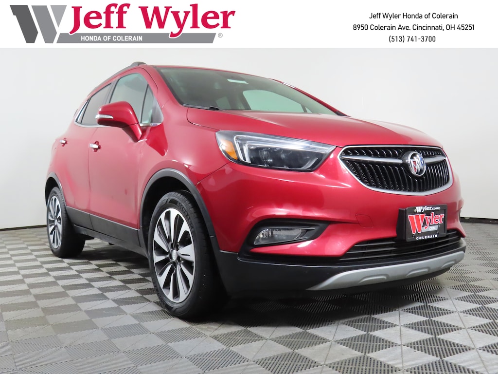 Jeff Wyler Honda of Colerain is pumped up to offer this outstanding 2018 Buick Encore Essence in Winterberry Red Metallic. Well equipped with: Preferred Equipment Group 1SL (6-Speaker Audio System), 18" Aluminum Wheels, 3.53 Final Drive Axle Ratio, 4-Wheel Disc Brakes, 6 Speakers, 6-Way Power Driver Seat Adjuster, 6-Way Power Front Passenger Seat Adjuster, ABS brakes, Air Conditioning, Alloy wheels, AM/FM radio: SiriusXM, Apple CarPlay/Android Auto, Auto-dimming Rear-View mirror, Automatic temperature control, Brake assist, Bumpers: body-color, Compass, Custom Molded Cargo Tray (LPO), Delay-off headlights, Driver door bin, Driver vanity mirror, Driver's Seat Mounted Armrest, Dual front impact airbags, Dual front side impact airbags, Electronic Stability Control, Emergency communication system: OnStar Guidance, Exterior Parking Camera Rear, Front anti-roll bar, Front Bucket Seats, Front dual zone A/C, Front fog lights, Front License Plate Bracket, Front reading lights, Front wheel independent suspension, Fully automatic headlights, Heated door mirrors, Heated Driver & Front Passenger Seats, Heated front seats, Heated steering wheel, Illuminated entry, Knee airbag, Leather-Appointed Seat Trim, Low tire pressure warning, Memory seat, Occupant sensing airbag, Outside temperature display, Overhead airbag, Panic alarm, Passenger door bin, Passenger vanity mirror, Power door mirrors, Power driver seat, Power passenger seat, Power steering, Power windows, Radio data system, Radio: Buick Infotainment System AM/FM Stereo, Rear seat center armrest, Rear side impact airbag, Rear window defroster, Rear window wiper, Remote keyless entry, Ride & Handling Suspension, Roof rack: rails only, Security system, SiriusXM Satellite Radio, Speed control, Speed-sensing steering, Split folding rear seat, Spoiler, Steering wheel mounted audio controls, Tachometer, Telescoping steering wheel, Tilt steering wheel, Traction control, Trip computer, Turn signal indicator mirrors, and Variably intermittent wipers.
