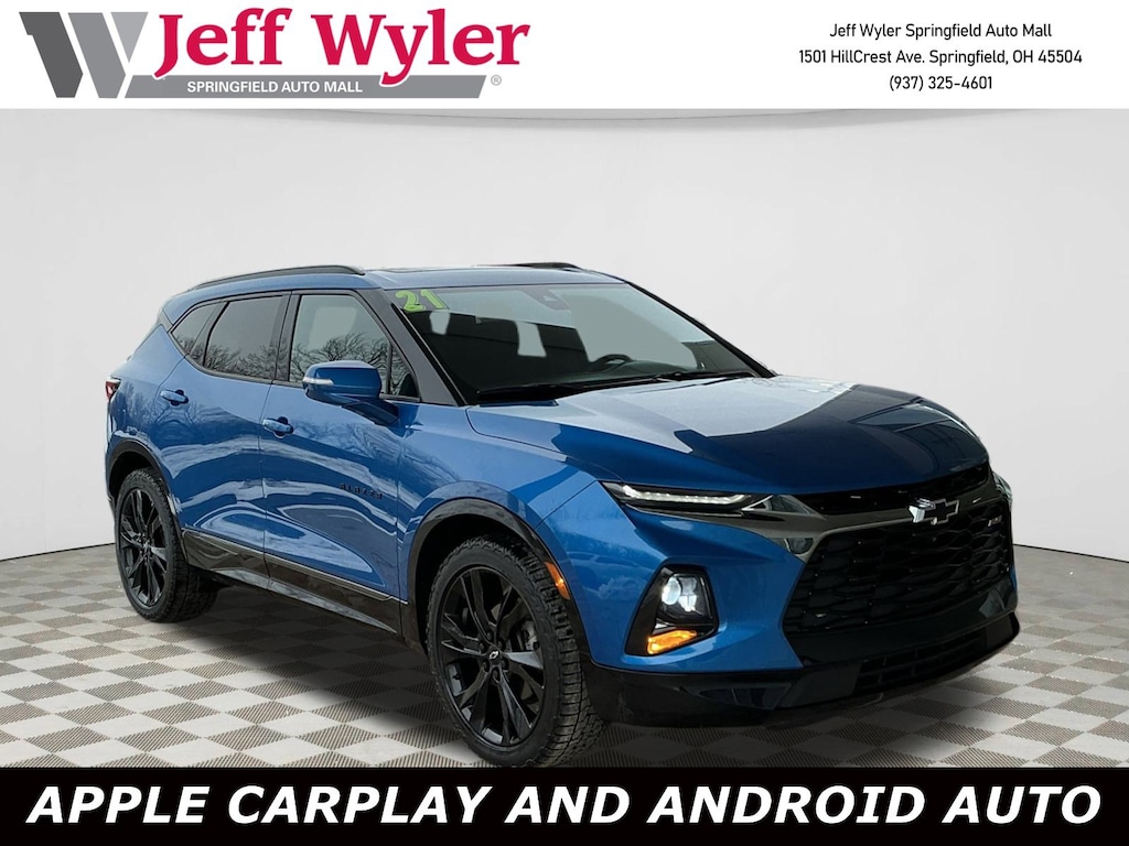Jeff Wyler Springfield Auto Mall is proud to offer this gorgeous-looking 2021 Chevrolet Blazer RS in Bright Blue Metallic. Well equipped with: Driver Confidence II Package (Adaptive Cruise Control, Enhanced Automatic Emergency Braking, HD Surround Vision, LED Headlamps, Rear Camera Mirror, Rear Camera Mirror Washer, Safety Alert Seat, and Wireless Charging), Enhanced Convenience Package (Heated Rear Outboard Seating Positions, Memory Settings For Driver Seat & Exterior Mirrors, Power Tilt & Telescoping Steering Column, and Ventilated Driver & Front Passenger Seats), Preferred Equipment Group 1RS, Trailering Equipment (Heavy-Duty Cooling System and Hitch Guidance), 3.49 Final Drive Axle Ratio, 4-Wheel Disc Brakes, 6 Speakers, 6-Speaker Audio System Feature, 6-Way Power Front Passenger Seat Adjuster, ABS brakes, Air Conditioning, Alloy wheels, AM/FM radio: SiriusXM, Apple CarPlay/Android Auto, Auto High-beam Headlights, Auto-dimming door mirrors, Auto-dimming Rear-View mirror, Automatic temperature control, Black Lug Nut & Wheel Lock Kit (LPO), Brake assist, Bumpers: body-color, Child-Seat-Sensing Airbag, Compass, Delay-off headlights, Driver door bin, Driver vanity mirror, Dual front impact airbags, Dual front side impact airbags, Electronic Stability Control, Emergency communication system: OnStar and Chevrolet connected services capable, Exterior Parking Camera Rear, Four wheel independent suspension, Front anti-roll bar, Front Bucket Seats, Front Center Armrest, Front dual zone A/C, Front reading lights, Fully automatic headlights, Garage door transmitter, Heated door mirrors, Heated Driver & Front Passenger Seats, Heated front seats, Heated steering wheel, High-Intensity Discharge Headlights, Illuminated entry, Knee airbag, Leather Shift Knob, Low tire pressure warning, Navigation System, Occupant sensing airbag, Outside temperature display, Overhead airbag, Overhead console, Panic alarm, Passenger door bin, Passenger vanity mirror, Perforated Leather-Appointed Seat Trim, Power door mirrors, Power driver seat, Power Liftgate, Power Panoramic Tilt-Sliding Sunroof, Power passenger seat, Power steering, Power windows, Radio data system, Radio: Chevrolet Infotainment 3 Plus System, Rear anti-roll bar, Rear reading lights, Rear seat center armrest, Rear window defroster, Rear window wiper, Remote keyless entry, Ride & Handling Suspension, Security system, SiriusXM w/360L, Speed control, Speed-sensing steering, Split folding rear seat, Spoiler, Steering wheel mounted audio controls, Tachometer, Telescoping steering wheel, Tilt steering wheel, Traction control, Trip computer, Turn signal indicator mirrors, Variably intermittent wipers, Voltmeter, Wheels: 20" Dark Android Machined-Face Aluminum, and Wheels: 21" Gloss Black Aluminum. Awards: * JD Power Automotive Performance, Execution and Layout (APEAL) Study Ask about available certifications. Used vehicles 10 years of age or newer with less than 100,000 miles are eligible for the Wyler Assurance Program, but eligible vehicles must pass our reconditioning process and multi-point inspection. Provided the vehicle passes inspection, vehicles will be eligible for the 6 month/6,000 mile limited warranty. The 6 month/6,000 mile limited warranty is NOT available on AS-IS vehicles, wholesale vehicles, lease buyback/pass-thru vehicles or un-inspected vehicles. Note that this program can also apply to vehicles where the remaining factory coverage is less than 6 months or 6,000 miles. Please check the Federal Trade Commission (FTC) Buyers guide on the vehicle for full details as to whether or not warranty coverage may apply. Contact Dealer for additional details. The Wyler Assurance 6 month/6,000 Mile limited warranty ends 6 months from the date of the Retail Purchase Agreement (BUYERS ORDER) or when the vehicle's odometer registers 6,000 additional miles to the mileage listed on the BUYERS ORDER, whichever comes first. Your Deductible - The warranty holder on your contract pays the first