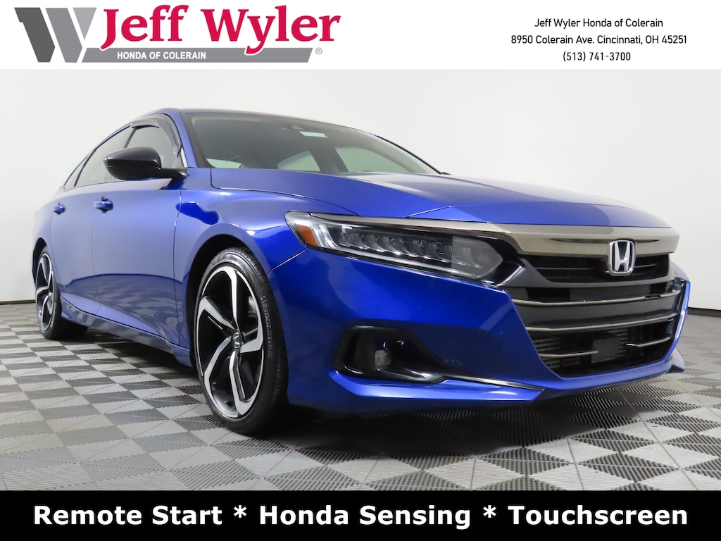 Jeff Wyler Honda of Colerain is very proud to offer this stunning-looking 2021 Honda Accord Sport Special Edition in Still Night Pearl. Well equipped with: 4-Wheel Disc Brakes, 8 Speakers, ABS brakes, Adaptive Cruise Control: Adaptive Cruise Control (ACC) with Low-Speed Follow, Air Conditioning, Alloy wheels, AM/FM radio, Apple CarPlay/Android Auto, Auto High-beam Headlights, Automatic temperature control, Brake assist, Bumpers: body-color, Delay-off headlights, Driver door bin, Driver vanity mirror, Dual front impact airbags, Dual front side impact airbags, Electronic Stability Control, Emergency communication system: HondaLink, Exterior Parking Camera Rear, Forward collision: Collision Mitigation Braking System (CMBS) + FCW mitigation, Four wheel independent suspension, Front anti-roll bar, Front Bucket Seats, Front Center Armrest, Front dual zone A/C, Front fog lights, Front reading lights, Fully automatic headlights, Heated door mirrors, Heated Front Bucket Seats, Heated front seats, Illuminated entry, Knee airbag, Lane Departure Warning System, Leather Shift Knob, Leather steering wheel, Leather-Trimmed Seats, Low tire pressure warning, Occupant sensing airbag, Outside temperature display, Overhead airbag, Overhead console, Panic alarm, Passenger door bin, Passenger vanity mirror, Power door mirrors, Power driver seat, Power passenger seat, Power steering, Power windows, Radio data system, Radio: 180-Watt AM/FM Audio System, Rear anti-roll bar, Rear seat center armrest, Rear window defroster, Remote keyless entry, Security system, Speed control, Speed-sensing steering, Speed-Sensitive Wipers, Split folding rear seat, Spoiler, Steering wheel mounted audio controls, Tachometer, Telescoping steering wheel, Tilt steering wheel, Traction control, Trip computer, Variably intermittent wipers, and Wheels: 19" Machine-Finished Alloy w/Black Inserts.