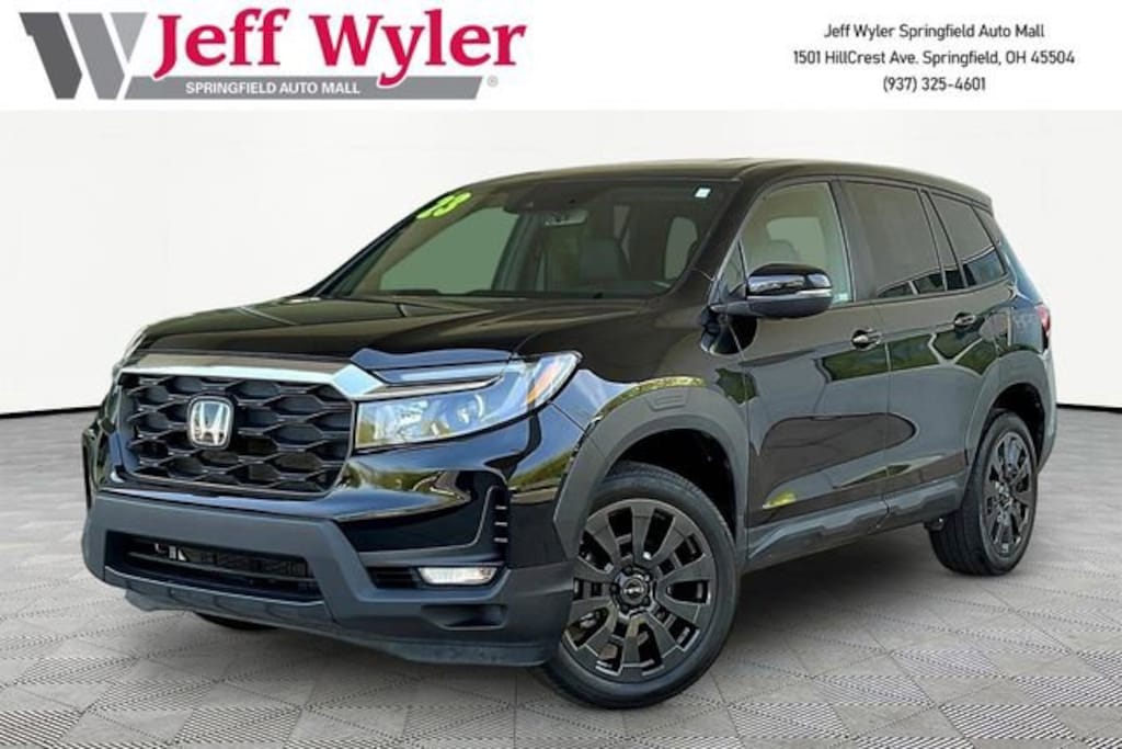 Jeff Wyler Springfield Auto Mall is delighted to offer this stunning 2023 Honda Passport EX-L in Crystal Black Pearl. Well equipped with: 4-Wheel Disc Brakes, 4.334 Axle Ratio, 7 Speakers, A/V remote: CabinControl, ABS brakes, Air Conditioning, Alloy wheels, AM/FM radio: SiriusXM, Apple CarPlay/Android Auto, Auto High-beam Headlights, Auto-dimming Rear-View mirror, Automatic temperature control, Blind Spot Information (BSI) System warning, Brake assist, Bumpers: body-color, Delay-off headlights, Driver door bin, Driver vanity mirror, Driver's Seat Mounted Armrest, Dual front impact airbags, Dual front side impact airbags, Electronic Stability Control, Emergency communication system: HondaLink Assist, Exterior Parking Camera Rear, Four wheel independent suspension, Front anti-roll bar, Front Bucket Seats, Front Center Armrest, Front dual zone A/C, Front reading lights, Fully automatic headlights, Garage door transmitter: HomeLink, Heated door mirrors, Heated Front Bucket Seats, Heated front seats, Illuminated entry, Lane departure: Lane Keeping Assist System (LKAS) active, Leather-Trimmed Seats, Low tire pressure warning, Occupant sensing airbag, Outside temperature display, Overhead airbag, Overhead console, Panic alarm, Passenger door bin, Passenger seat mounted armrest, Passenger vanity mirror, Power door mirrors, Power driver seat, Power Liftgate, Power moonroof, Power passenger seat, Power steering, Power windows, Radio data system, Radio: 215-Watt Audio System w/7 Speakers, Rear air conditioning, Rear anti-roll bar, Rear reading lights, Rear seat center armrest, Rear window defroster, Rear window wiper, Remote keyless entry, Security system, Speed control, Speed-sensing steering, Split folding rear seat, Spoiler, Steering wheel mounted audio controls, Tachometer, Telescoping steering wheel, Tilt steering wheel, Traction control, Trip computer, Turn signal indicator mirrors, Variably intermittent wipers, and Wheels: 20 Pewter Gray Alloy. Ask about available certifications. Used vehicles 10 years of age or newer with less than 100,000 miles are eligible for the Wyler Assurance Program, but eligible vehicles must pass our reconditioning process and multi-point inspection. Provided the vehicle passes inspection, vehicles will be eligible for the 6 month/6,000 mile limited warranty. The 6 month/6,000 mile limited warranty is NOT available on AS-IS vehicles, wholesale vehicles, lease buyback/pass-thru vehicles or un-inspected vehicles. Note that this program can also apply to vehicles where the remaining factory coverage is less than 6 months or 6,000 miles. Please check the Federal Trade Commission (FTC) Buyers guide on the vehicle for full details as to whether or not warranty coverage may apply. Contact Dealer for additional details. The Wyler Assurance 6 month/6,000 Mile limited warranty ends 6 months from the date of the Retail Purchase Agreement (BUYERS ORDER) or when the vehicle's odometer registers 6,000 additional miles to the mileage listed on the BUYERS ORDER, whichever comes first. Your Deductible - The warranty holder on your contract pays the first $100 of each covered repair.