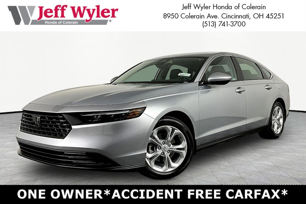 Jeff Wyler Honda of Colerain is very proud to offer this good-looking 2024 Honda Accord LX in Solar Silver Metallic. Well equipped with: 4 Speakers, 4-Wheel Disc Brakes, ABS brakes, Adaptive Cruise Control: Adaptive Cruise Control (ACC) with Low-Speed Follow, Air Conditioning, Alloy wheels, AM/FM radio, Apple CarPlay/Android Auto, Auto High-beam Headlights, Automatic temperature control, Brake assist, Bumpers: body-color, Compass, Delay-off headlights, Driver door bin, Driver vanity mirror, Dual front impact airbags, Dual front side impact airbags, Electronic Stability Control, Emergency communication system: HondaLink Assist, Exterior Parking Camera Rear, Fabric Seat Trim, Four wheel independent suspension, Front anti-roll bar, Front Bucket Seats, Front Center Armrest, Front reading lights, Fully automatic headlights, Illuminated entry, Knee airbag, Lane departure: Lane Keeping Assist System (LKAS) active, Low tire pressure warning, Occupant sensing airbag, Outside temperature display, Overhead airbag, Overhead console, Panic alarm, Passenger door bin, Passenger vanity mirror, Power door mirrors, Power steering, Power windows, Radio data system, Radio: 160-Watt AM/FM Audio System, Rear anti-roll bar, Rear reading lights, Rear seat center armrest, Rear side impact airbag, Rear window defroster, Remote keyless entry, Security system, Speed control, Speed-sensing steering, Speed-Sensitive Wipers, Steering wheel mounted audio controls, Tachometer, Telescoping steering wheel, Tilt steering wheel, Traction control, Trip computer, Variably intermittent wipers, and Wheels: 17" x 7.5" Blade Silver.