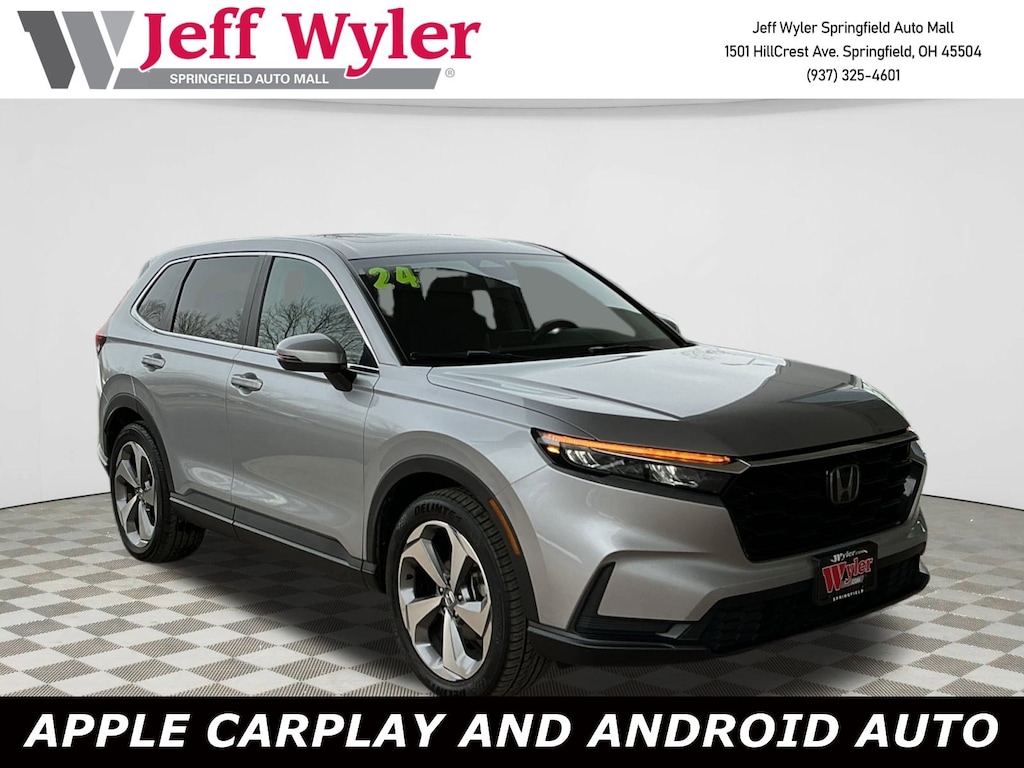 Jeff Wyler Springfield Auto Mall is honored to offer this good-looking 2024 Honda CR-V EX in Silver. Well equipped with: 4-Wheel Disc Brakes, 5.64 Axle Ratio, 6 Speakers, ABS brakes, Adaptive Cruise Control: Adaptive Cruise Control (ACC) with Low-Speed Follow, Air Conditioning, Alloy wheels, Apple CarPlay/Android Auto, Auto High-beam Headlights, Automatic temperature control, Blind Spot Information (BSI) System warning, Brake assist, Bumpers: body-color, Cloth Seat Trim, Compass, Delay-off headlights, Driver door bin, Driver vanity mirror, Dual front impact airbags, Dual front side impact airbags, Electronic Stability Control, Exterior Parking Camera Rear, Four wheel independent suspension, Front anti-roll bar, Front Bucket Seats, Front Center Armrest, Front dual zone A/C, Front reading lights, Fully automatic headlights, Heated door mirrors, Heated Front Bucket Seats, Heated front seats, Illuminated entry, Knee airbag, Low tire pressure warning, Occupant sensing airbag, Outside temperature display, Overhead airbag, Overhead console, Panic alarm, Passenger door bin, Passenger vanity mirror, Power door mirrors, Power driver seat, Power moonroof, Power steering, Power windows, Radio data system, Radio: 240-Watt AM/FM Audio System, Rear anti-roll bar, Rear reading lights, Rear seat center armrest, Rear side impact airbag, Rear window defroster, Rear window wiper, Remote keyless entry, Security system, Speed control, Speed-sensing steering, Speed-Sensitive Wipers, Split folding rear seat, Spoiler, Steering wheel mounted audio controls, Tachometer, Telescoping steering wheel, Tilt steering wheel, Traction control, Trip computer, Turn signal indicator mirrors, Variably intermittent wipers, and Wheels: 18" Sparkle Silver Metallic. Ask about available certifications. Used vehicles 10 years of age or newer with less than 100,000 miles are eligible for the Wyler Assurance Program, but eligible vehicles must pass our reconditioning process and multi-point inspection. Provided the vehicle passes inspection, vehicles will be eligible for the 6 month/6,000 mile limited warranty. The 6 month/6,000 mile limited warranty is NOT available on AS-IS vehicles, wholesale vehicles, lease buyback/pass-thru vehicles or un-inspected vehicles. Note that this program can also apply to vehicles where the remaining factory coverage is less than 6 months or 6,000 miles. Please check the Federal Trade Commission (FTC) Buyers guide on the vehicle for full details as to whether or not warranty coverage may apply. Contact Dealer for additional details. The Wyler Assurance 6 month/6,000 Mile limited warranty ends 6 months from the date of the Retail Purchase Agreement (BUYERS ORDER) or when the vehicle's odometer registers 6,000 additional miles to the mileage listed on the BUYERS ORDER, whichever comes first. Your Deductible - The warranty holder on your contract pays the first $100 of each covered repair.