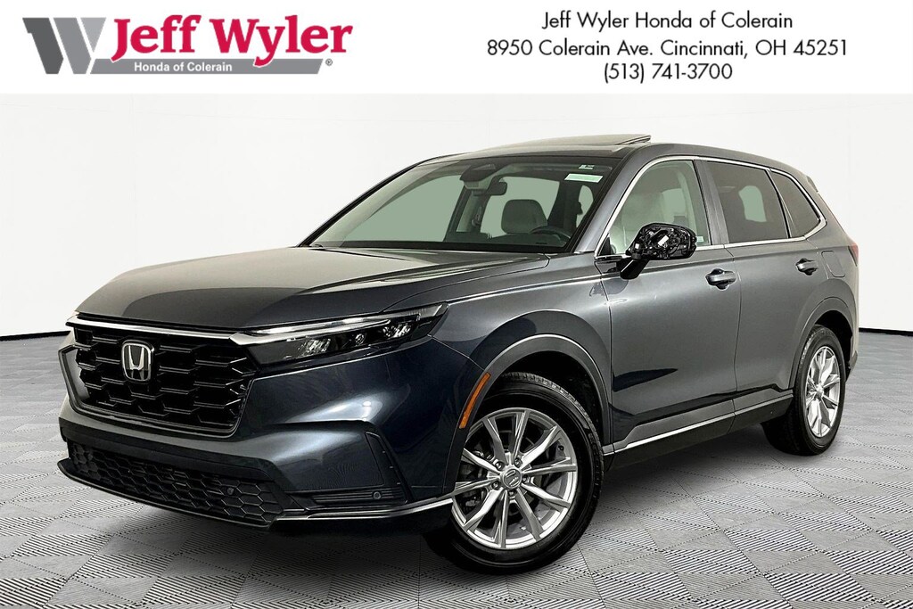 Jeff Wyler Honda of Colerain is very proud to offer this great 2025 Honda CR-V EX-L in Solar Silver Metallic. Well equipped with: 4-Wheel Disc Brakes, 8 Speakers, ABS brakes, Adaptive Cruise Control: Adaptive Cruise Control (ACC) with Low-Speed Follow, Air Conditioning, Alloy wheels, AM/FM radio: SiriusXM, Auto High-beam Headlights, Auto-dimming Rear-View mirror, Automatic temperature control, Blind Spot Information (BSI) System warning, Brake assist, Bumpers: body-color, Compass, Delay-off headlights, Driver door bin, Driver vanity mirror, Dual front impact airbags, Dual front side impact airbags, Electronic Stability Control, Exterior Parking Camera Rear, Four wheel independent suspension, Front anti-roll bar, Front Bucket Seats, Front Center Armrest, Front dual zone A/C, Front reading lights, Fully automatic headlights, Heated door mirrors, Heated Front Bucket Seats, Heated front seats, Illuminated entry, Knee airbag, Leather Seat Trim, Leather Shift Knob, Leather steering wheel, Low tire pressure warning, Memory seat, Occupant sensing airbag, Outside temperature display, Overhead airbag, Overhead console, Panic alarm, Passenger door bin, Passenger vanity mirror, Power door mirrors, Power driver seat, Power Liftgate, Power moonroof, Power passenger seat, Power steering, Power windows, Radio data system, Radio: 320-Watt AM/FM/HD/SiriusXM Audio System, Rear anti-roll bar, Rear reading lights, Rear seat center armrest, Rear side impact airbag, Rear window defroster, Rear window wiper, Remote keyless entry, Security system, Speed control, Speed-sensing steering, Speed-Sensitive Wipers, Split folding rear seat, Spoiler, Steering wheel mounted audio controls, Tachometer, Telescoping steering wheel, Tilt steering wheel, Traction control, Trip computer, Turn signal indicator mirrors, Variably intermittent wipers, and Wheels: 18" Sparkle Silver Alloy Metallic.