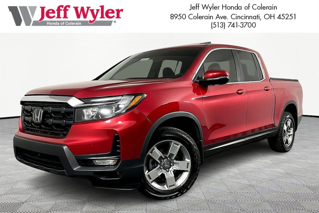 Jeff Wyler Honda of Colerain is very proud to offer this handsome 2025 Honda Ridgeline RTL in Radiant Red Metallic II. Well equipped with: 4-Wheel Disc Brakes, 4.33 Axle Ratio, 7 Speakers, ABS brakes, Air Conditioning, Alloy wheels, AM/FM radio: SiriusXM, Auto-dimming Rear-View mirror, Automatic temperature control, Blind Spot Information (BSI) System warning, Bluetooth® Hands-Free Link, Brake assist, Bumpers: body-color, Compass, Delay-off headlights, Driver door bin, Driver vanity mirror, Driver's Seat Mounted Armrest, Dual front impact airbags, Dual front side impact airbags, Electronic Stability Control, Emergency communication system: HondaLink Assist, Exterior Parking Camera Rear, Four wheel independent suspension, Front anti-roll bar, Front Bucket Seats, Front dual zone A/C, Front fog lights, Front reading lights, Fully automatic headlights, Garage door transmitter: HomeLink, Heated door mirrors, Heated Front Bucket Seats, Heated front seats, Illuminated entry, Leather Seat Trim, Leather steering wheel, Low tire pressure warning, Memory seat, Occupant sensing airbag, Outside temperature display, Overhead airbag, Overhead console, Panic alarm, Passenger door bin, Passenger seat mounted armrest, Passenger vanity mirror, Power door mirrors, Power driver seat, Power moonroof, Power passenger seat, Power steering, Power windows, Radio data system, Radio: 215-Watt Audio System w/7 Speakers, Rear air conditioning, Rear anti-roll bar, Rear reading lights, Rear seat center armrest, Rear step bumper, Rear window defroster, Remote keyless entry, Security system, SiriusXM, Speed control, Speed-sensing steering, Split folding rear seat, Steering wheel mounted audio controls, Tachometer, Telescoping steering wheel, Tilt steering wheel, Traction control, Trip computer, Turn signal indicator mirrors, Variably intermittent wipers, and Wheels: 18" Pewter Gray Machine-Finished Alloy.