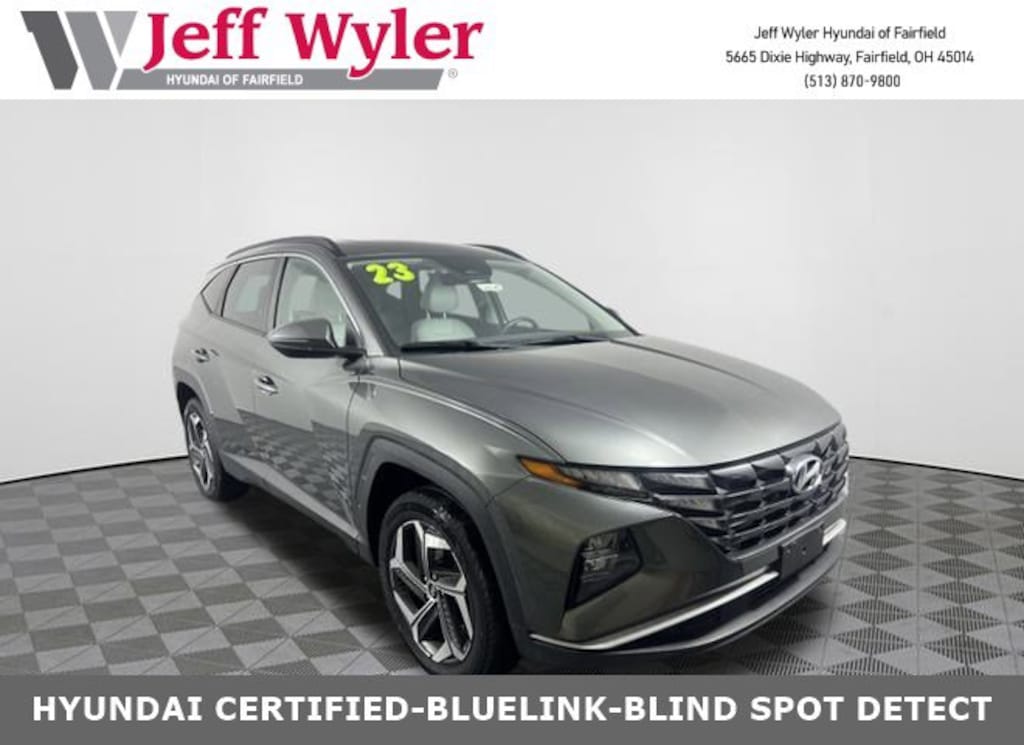 CARFAX One-Owner. Clean CARFAX. Jeff Wyler Hyundai of Fairfield is honored to offer this gorgeous-looking 2023 Hyundai Tucson SEL in Amazon Gray. Well equipped with: Cargo Package (Cargo Net, Cargo Tray, and First Aid Kit), Convenience Package (10.25" Digital Instrument Cluster, Auto-Dimming Interior Mirror w/Homelink, Dual Automatic Temperature Control, H-Tex Seat Trim, Leather-Wrapped Shift Knob, Leather-Wrapped Steering Wheel, LED Interior Lights (Room, Map), Option Group 02, Power Sunroof, Ultrasonic Rear Occupant Alert, and Wheels: 19" x 7.5J" Machine-Face Finish Alloy), AWD, Android Auto, Apple CarPlay, CALL NOW FOR YOUR VIP APPOINTMENT 513-870-9800, FULLY SERVICED w/RECORDS, GUARANTEED FINANCING!! NO MATTER YOUR SITUATION WE CAN GET AN APPROVAL!!, THE #1 Volume dealer in the region! Come see why for yourself Today!!, WE PAY MORE FOR YOUR TRADE!!, 3.648 Axle Ratio, 4-Wheel Disc Brakes, 6 Speakers, ABS brakes, Air Conditioning, Alloy wheels, AM/FM radio: SiriusXM, Apple CarPlay & Android Auto, Auto High-beam Headlights, Brake assist, Bumpers: body-color, Cargo Cover, Carpeted Floor Mats, Delay-off headlights, Driver door bin, Driver vanity mirror, Dual front impact airbags, Dual front side impact airbags, Electronic Stability Control, Emergency communication system: Blue Link Connected Car Service (3-year complimentary subscription), Four wheel independent suspension, Front anti-roll bar, Front Bucket Seats, Front Center Armrest, Front reading lights, Fully automatic headlights, Heated door mirrors, Heated Front Bucket Seats, Heated front seats, Illuminated entry, Low tire pressure warning, Occupant sensing airbag, Outside temperature display, Overhead airbag, Overhead console, Panic alarm, Passenger door bin, Passenger vanity mirror, Power door mirrors, Power driver seat, Power Liftgate, Power steering, Power windows, Radio data system, Radio: AM/FM/HD/SiriusXM Audio System, Rear anti-roll bar, Rear Bumper Applique, Rear seat center armrest, Rear window defroster, Rear window wiper, Remote keyless entry, Roof rack: rails only, Security system, Speed control, Split folding rear seat, Spoiler, Stain & Odor Resistant Cloth Seat Trim, Steering wheel mounted audio controls, Tachometer, Telescoping steering wheel, Tilt steering wheel, Traction control, Trip computer, Turn signal indicator mirrors, Variably intermittent wipers, Wheel Locks, and Wheels: 17" x 7.0J" Alloy. TO CHECK ON THE AVAILABILITY OF THIS VEHICLE REACH OUT TO ONE OF OUR TEAM MEMBERS!! ALSO SHOP ONLINE AT https://www.jeffwylerhyundaioffairfield.com/ Proudly Serving: Cincinnati, Dayton, Columbus, Louisville, Lexington, Indianapolis, Hamilton, Florence, Alexandria, Beavercreek, Springdale, West Chester, Monroe, Fairfield, Kenwood, Newport and all of greater Cincinnati Ohio, Indiana, and Northern Kentucky.