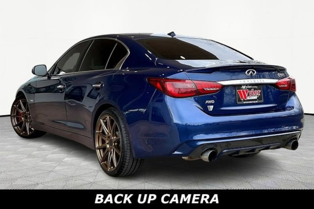 Jeff Wyler Springfield Auto Mall is pleased to offer this handsome 2019 INFINITI Q50 Red Sport 400 in Blue. Well equipped with: 4-Wheel Disc Brakes, 6 Speakers, ABS brakes, Adaptive suspension, Air Conditioning, Alloy wheels, AM/FM radio: SiriusXM, Anti-whiplash front head restraints, Auto-dimming Rear-View mirror, Automatic temperature control, Brake assist, Bumpers: body-color, CD player, Compass, Delay-off headlights, Driver door bin, Driver vanity mirror, Dual front impact airbags, Dual front side impact airbags, Electronic Stability Control, Emergency communication system: INFINITI Connection, Four wheel independent suspension, Front anti-roll bar, Front Bucket Seats, Front Center Armrest, Front dual zone A/C, Front fog lights, Front reading lights, Fully automatic headlights, Garage door transmitter: HomeLink, Heated door mirrors, Heated front seats, Heated Front Sport Seats, Heated steering wheel, Illuminated entry, Leather Shift Knob, Leather steering wheel, Low tire pressure warning, Navigation system: INFINITI InTouch Navigation, Occupant sensing airbag, Outside temperature display, Overhead airbag, Overhead console, Panic alarm, Passenger door bin, Passenger vanity mirror, Power door mirrors, Power driver seat, Power moonroof, Power passenger seat, Power steering, Power windows, Quilted Semi-Aniline Leather Seating Surfaces, Radio data system, Radio: INFINITI InTouch Navigation, Rain sensing wipers, Rear anti-roll bar, Rear reading lights, Rear seat center armrest, Rear window defroster, Remote keyless entry, Security system, Speed control, Speed-sensing steering, Speed-Sensitive Wipers, Split folding rear seat, Steering wheel mounted audio controls, Tachometer, Telescoping steering wheel, Tilt steering wheel, Traction control, Trip computer, Turn signal indicator mirrors, Variably intermittent wipers, and Wheels: 19 x 9 Aluminum-Alloy. Awards: