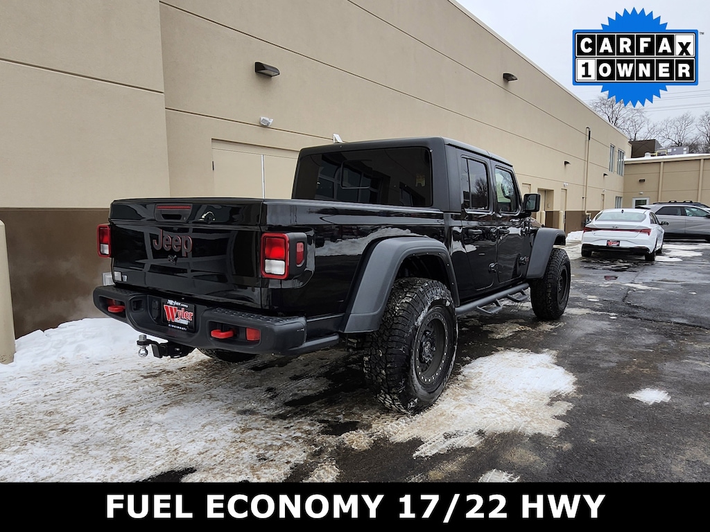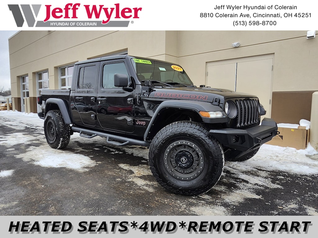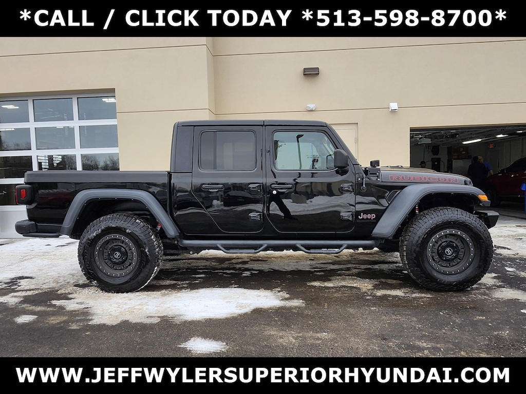 Jeff Wyler Superior Hyundai is excited to offer this fantastic-looking 2021 Jeep Gladiator Rubicon in Black Clearcoat. Well equipped with: Cold Weather Group (Heated Front Seats and Heated Steering Wheel), GVWR: 6,250 lbs w/Max Tow Package, Quick Order Package 24R, Trailer Tow Package (240 Amp Alternator, Class IV Hitch Receiver, Heavy-Duty Engine Cooling, and Trailer Hitch Zoom), 4-Wheel Disc Brakes, 4.10 Rear Axle Ratio, 8 Speakers, 97 mph Maximum Speed Calibration, ABS brakes, Air Conditioning, Alloy wheels, AM/FM radio: SiriusXM, Apple CarPlay/Android Auto, Automatic temperature control, Black 3-Piece Hard Top, Brake assist, Compass, Delay-off headlights, Driver door bin, Driver vanity mirror, Dual front impact airbags, Dual front side impact airbags, Electronic Stability Control, Freedom Panel Storage Bag, Front anti-roll bar, Front Bucket Seats, Front Center Armrest w/Storage, Front dual zone A/C, Front fog lights, Front License Plate Bracket, Front reading lights, Fully automatic headlights, Garage door transmitter, Heated door mirrors, Illuminated entry, Integrated roll-over protection, Leather steering wheel, Low tire pressure warning, MOPAR All-Weather Floor Mats (DISC), MOPAR Hardtop Headliner, MOPAR Spray In Bedliner, Occupant sensing airbag, Outside temperature display, Panic alarm, ParkView Rear Back-Up Camera, Passenger door bin, Passenger vanity mirror, Performance Suspension, Power door mirrors, Power steering, Power windows, Premium Cloth Low-Back Bucket Seats, Radio data system, Radio: Uconnect 4 w/7" Display, Rear anti-roll bar, Rear reading lights, Rear Sliding Window, Rear Window Defroster, Redical Instrument Panel Bezels, Remote keyless entry, Remote Start System, Security system, Speed control, Split folding rear seat, Steering wheel mounted audio controls, Tachometer, Telescoping steering wheel, Tilt steering wheel, Traction control, Trip computer, Variably intermittent wipers, Voltmeter, and Wheels: 17" x 7.5" Granite Crystal Aluminum. CARFAX One-Owner. Clean CARFAX. This sales price excludes tax, title, and dealer fees. While every reasonable effort is made to ensure the accuracy of this information, we are not responsible for any errors or omissions contained on these pages. Used vehicles 10 years of age or newer with less than 100,000 miles are eligible for the Wyler Assurance Program, but eligible vehicles must pass our reconditioning process and multi-point inspection. Provided the vehicle passes inspection, vehicles will be eligible for the 6 month/6,000 mile limited warranty. The 6 month/6,000 mile limited warranty is NOT available on AS-IS vehicles, wholesale vehicles, lease buyback/pass-thru vehicles or un-inspected vehicles. Note that this program can also apply to vehicles where the remaining factory coverage is less than 6 months or 6,000 miles. Please check the Federal Trade Commission (FTC) Buyers guide on the vehicle for full details as to whether or not warranty coverage may apply. Contact Dealer for additional details. The Wyler Assurance 6 month/6,000 Mile limited warranty ends 6 months from the date of the Retail Purchase Agreement (BUYERS ORDER) or when the vehicle's odometer registers 6,000 additional miles to the mileage listed on the BUYERS ORDER, whichever comes first.Your Deductible - The warranty holder on your contract pays the first $100 of each covered repair.