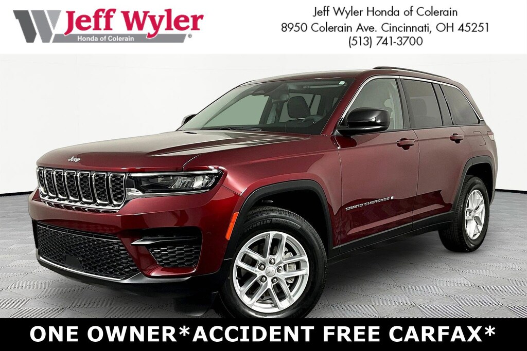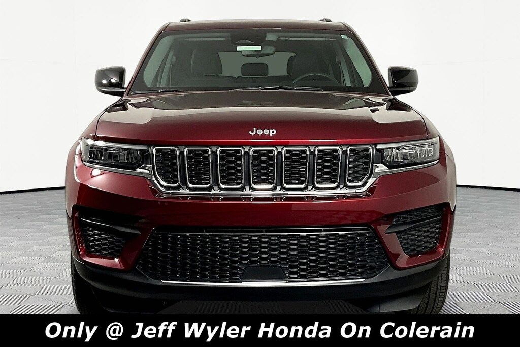 Jeff Wyler Honda of Colerain is pleased to offer this good-looking 2023 Jeep Grand Cherokee Laredo in Velvet Red Pearlcoat. Well equipped with: Quick Order Package 23A Laredo, 3.45 Rear Axle Ratio, 4-Wheel Disc Brakes, 6 Speakers, ABS brakes, Air Conditioning, Alloy wheels, Anti-whiplash front head restraints, Automatic temperature control, Brake assist, Bumpers: body-color, Cloth Seats, Compass, Delay-off headlights, Driver door bin, Driver vanity mirror, Dual front impact airbags, Dual front side impact airbags, Electronic Stability Control, Emergency communication system, Four wheel independent suspension, Front anti-roll bar, Front Bucket Seats, Front Center Armrest w/Storage, Front dual zone A/C, Front License Plate Bracket, Front reading lights, Fully automatic headlights, Heated door mirrors, Illuminated entry, Knee airbag, Low tire pressure warning, Molded In Color Black/Gloss Black Roof Rails, Normal Duty Suspension, Occupant sensing airbag, Outside temperature display, Overhead airbag, Overhead console, Panic alarm, ParkView Rear Back-Up Camera, Passenger door bin, Passenger vanity mirror, Power door mirrors, Power driver seat, Power steering, Power windows, Radio data system, Radio: Uconnect 5 w/8.4" Display, Rear anti-roll bar, Rear reading lights, Rear window defroster, Rear window wiper, Remote keyless entry, Security system, Speed control, Speed-Sensitive Wipers, Split folding rear seat, Spoiler, Steering wheel mounted audio controls, Tachometer, Telescoping steering wheel, Tilt steering wheel, Traction control, Trip computer, Variably intermittent wipers, Voltmeter, Wheels: 17" x 6.5" Fully Painted Aluminum, and Wheels: 18" x 8" Fully Painted Aluminum (DISC)