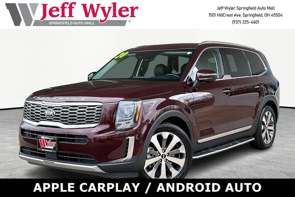 Jeff Wyler Springfield Auto Mall is excited to offer this great 2020 Kia Telluride EX in Sangria. Well equipped with: EX Premium Package (20" Alloy Wheels, 20" Wheels, Anodized Roof Rails, and Captain's Chairs), 3.648 Axle Ratio, 3rd row seats: split-bench, 4-Wheel Disc Brakes, 6 Speakers, ABS brakes, Air Conditioning, Alloy wheels, AM/FM radio: SiriusXM, Apple CarPlay & Android Auto, Auto-dimming Rear-View mirror, Automatic temperature control, Brake assist, Bumpers: body-color, Carpeted Floor Mats, Compass, Delay-off headlights, Driver door bin, Driver vanity mirror, Dual front impact airbags, Dual front side impact airbags, Electronic Stability Control, Emergency communication system: 911 Connect, Four wheel independent suspension, Front anti-roll bar, Front Bucket Seats, Front Center Armrest, Front dual zone A/C, Front reading lights, Fully automatic headlights, Heated & Ventilated Front Bucket Seats, Heated door mirrors, Heated front seats, Illuminated entry, Illuminated Scuff Plates, Knee airbag, Leather Shift Knob, Leather steering wheel, Leather-Trimmed Upholstery, Low tire pressure warning, Multi Colored Interior Light Kit, Navigation System, Occupant sensing airbag, Outside temperature display, Overhead airbag, Overhead console, Panic alarm, Passenger door bin, Passenger vanity mirror, Power door mirrors, Power driver seat, Power Liftgate, Power moonroof, Power passenger seat, Power steering, Power windows, Radio data system, Radio: AM/FM/MP3/SiriusXM Audio System, Rear air conditioning, Rear anti-roll bar, Rear audio controls, Rear reading lights, Rear seat center armrest, Rear window defroster, Rear window wiper, Reclining 3rd row seat, Remote keyless entry, Roof rack: rails only, Security system, Speed control, Speed-sensing steering, Split folding rear seat, Spoiler, Steering wheel mounted audio controls, Tachometer, Telescoping steering wheel, Tilt steering wheel, Traction control, Trip computer, Turn signal indicator mirrors, Variably intermittent wipers, Ventilated front seats, and Wheels: 7.5" x 18" Machined Finish Alloy. Awards: * JD Power Automotive Performance, Execution and Layout (APEAL) Study * Motor Trend Automobiles of the year * 2020 KBB.com 10 Best SUVs Worth Waiting For * 2020 KBB.com Best Buy Awards * NACTOY 2020 North American Utility of the Year * 2020 KBB.com 10 Favorite New-for-2020 Cars Ask about available certifications. Used vehicles 10 years of age or newer with less than 100,000 miles are eligible for the Wyler Assurance Program, but eligible vehicles must pass our reconditioning process and multi-point inspection. Provided the vehicle passes inspection, vehicles will be eligible for the 6 month/6,000 mile limited warranty. The 6 month/6,000 mile limited warranty is NOT available on AS-IS vehicles, wholesale vehicles, lease buyback/pass-thru vehicles or un-inspected vehicles. Note that this program can also apply to vehicles where the remaining factory coverage is less than 6 months or 6,000 miles. Please check the Federal Trade Commission (FTC) Buyers guide on the vehicle for full details as to whether or not warranty coverage may apply. Contact Dealer for additional details. The Wyler Assurance 6 month/6,000 Mile limited warranty ends 6 months from the date of the Retail Purchase Agreement (BUYERS ORDER) or when the vehicle's odometer registers 6,000 additional miles to the mileage listed on the BUYERS ORDER, whichever comes first. Your Deductible - The warranty holder on your contract pays the first $100 of each covered repair.