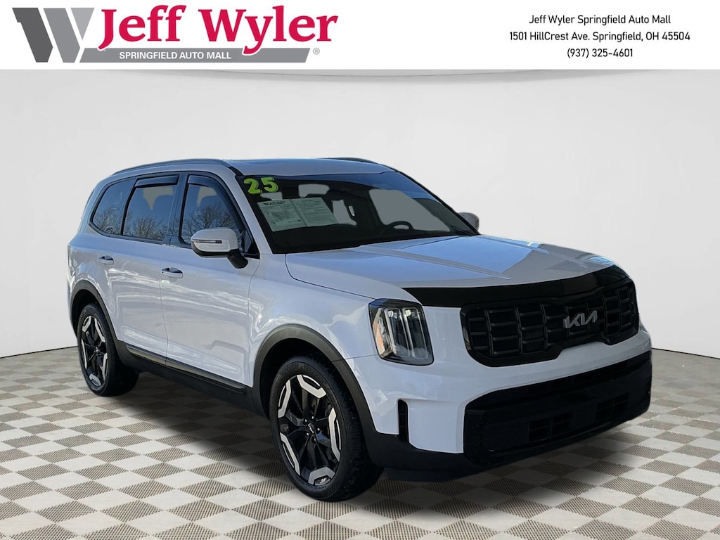 Jeff Wyler Springfield Auto Mall is pleased to offer this attractive-looking 2025 Kia Telluride S in Glacial White Pearl. Well equipped with: 3rd row seats: split-bench, 4-Wheel Disc Brakes, 6 Speakers, ABS brakes, Air Conditioning, Alloy wheels, AM/FM radio: SiriusXM, Apple CarPlay & Android Auto, Auto High-beam Headlights, Automatic temperature control, Brake assist, Bumpers: body-color, Carpeted Floor Mats, Delay-off headlights, Driver door bin, Driver vanity mirror, Dual front impact airbags, Dual front side impact airbags, Electronic Stability Control, Emergency communication system: 911 Connect, Exterior Parking Camera Rear, Four wheel independent suspension, Front anti-roll bar, Front Bucket Seats, Front Center Armrest, Front dual zone A/C, Front reading lights, Fully automatic headlights, Heated door mirrors, Heated Front Bucket Seats, Heated front seats, Illuminated entry, Knee airbag, Leather Shift Knob, Leather steering wheel, Low tire pressure warning, Navigation System, Occupant sensing airbag, Outside temperature display, Overhead airbag, Overhead console, Panic alarm, Passenger door bin, Passenger vanity mirror, Power door mirrors, Power driver seat, Power Liftgate, Power moonroof, Power steering, Power windows, Radio data system, Radio: AM/FM Display Audio System, Rear air conditioning, Rear anti-roll bar, Rear audio controls, Rear reading lights, Rear side impact airbag, Rear window defroster, Rear window wiper, Reclining 3rd row seat, Remote keyless entry, Security system, Speed control, Speed-sensing steering, Split folding rear seat, Spoiler, Steering wheel mounted audio controls, SynTex Synthetic Leather Seat Trim, Tachometer, Telescoping steering wheel, Tilt steering wheel, Traction control, Trip computer, Turn signal indicator mirrors, Variably intermittent wipers, and Wheels: 20" x 7.5" Black Finish. Ask about available certifications. Used vehicles 10 years of age or newer with less than 100,000 miles are eligible for the Wyler Assurance Program, but eligible vehicles must pass our reconditioning process and multi-point inspection. Provided the vehicle passes inspection, vehicles will be eligible for the 6 month/6,000 mile limited warranty. The 6 month/6,000 mile limited warranty is NOT available on AS-IS vehicles, wholesale vehicles, lease buyback/pass-thru vehicles or un-inspected vehicles. Note that this program can also apply to vehicles where the remaining factory coverage is less than 6 months or 6,000 miles. Please check the Federal Trade Commission (FTC) Buyers guide on the vehicle for full details as to whether or not warranty coverage may apply. Contact Dealer for additional details. The Wyler Assurance 6 month/6,000 Mile limited warranty ends 6 months from the date of the Retail Purchase Agreement (BUYERS ORDER) or when the vehicle's odometer registers 6,000 additional miles to the mileage listed on the BUYERS ORDER, whichever comes first. Your Deductible - The warranty holder on your contract pays the first $100 of each covered repair.