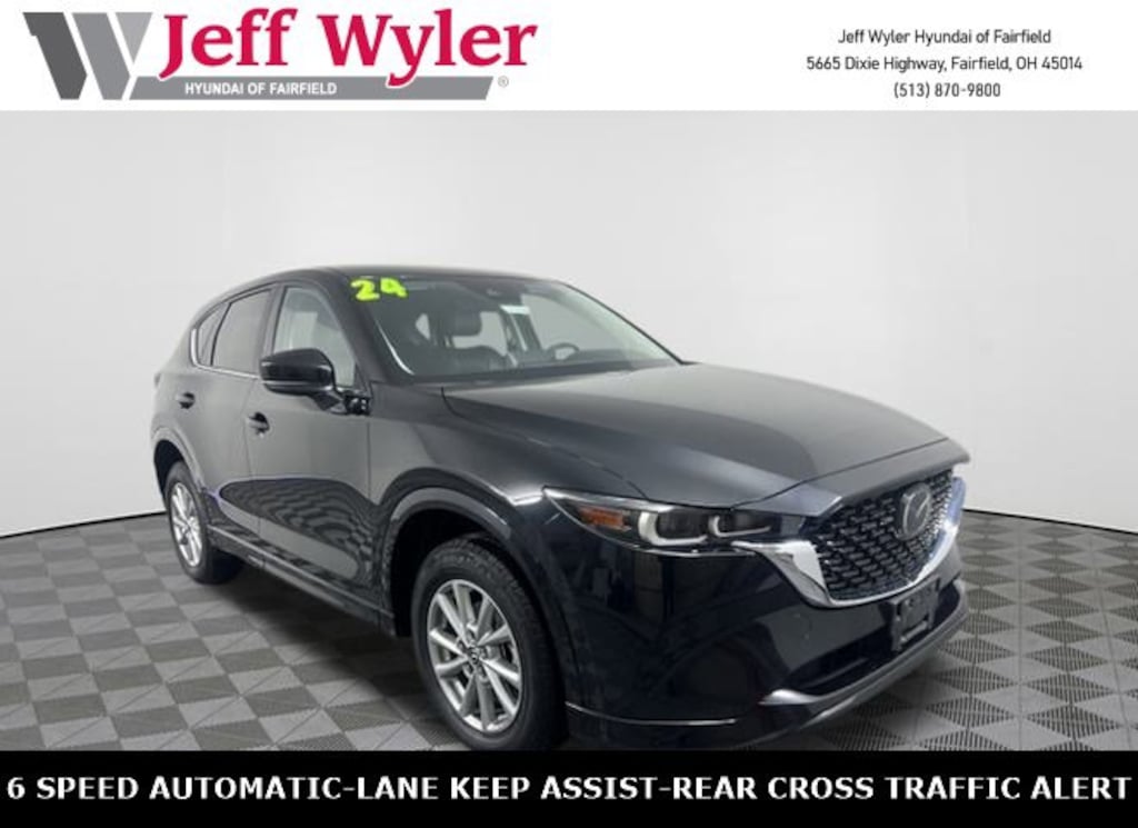 CARFAX One-Owner. Clean CARFAX. Jeff Wyler Hyundai of Fairfield is proud to offer this outstanding 2024 Mazda CX-5 2.5 S Select Package in Jet Black. Well equipped with: Android Auto, Apple CarPlay, CALL NOW FOR YOUR VIP APPOINTMENT 513-870-9800, FULLY SERVICED w/RECORDS, GUARANTEED FINANCING!! NO MATTER YOUR SITUATION WE CAN GET AN APPROVAL!!, THE #1 Volume dealer in the region! Come see why for yourself Today!!, WE PAY MORE FOR YOUR TRADE!!, 4-Wheel Disc Brakes, 6 Speakers, ABS brakes, Air Conditioning, Alloy wheels, AM/FM radio, AppLink/Apple CarPlay and Android Auto, Auto High-beam Headlights, Automatic temperature control, Brake assist, Bumpers: body-color, Delay-off headlights, Driver door bin, Driver vanity mirror, Dual front impact airbags, Dual front side impact airbags, E911 Automatic Emergency Notification, Electronic Stability Control, Emergency communication system: MAZDA CONNECT, Exterior Parking Camera Rear, Four wheel independent suspension, Front anti-roll bar, Front Bucket Seats, Front Center Armrest w/Storage, Front dual zone A/C, Front reading lights, Fully automatic headlights, Heated Front Bucket Seats, Heated front seats, Illuminated entry, Infotainment System Voice Command, Leather Shift Knob, Leather steering wheel, Leatherette Seat Trim, Low tire pressure warning, Multifunction Commander Control, Occupant sensing airbag, Outside temperature display, Overhead airbag, Overhead console, Pandora, Panic alarm, Passenger door bin, Passenger vanity mirror, Power door mirrors, Power driver seat, Power steering, Power windows, Radio Broadcast Data System Program Information, Radio data system, Radio: AM/FM/HD Audio System, Rain sensing wipers, Rear anti-roll bar, Rear reading lights, Rear seat center armrest, Rear window defroster, Rear window wiper, Remote keyless entry, SMS Text Msg Audio Delivery & Reply, Speed control, Speed-sensing steering, Split folding rear seat, Spoiler, Steering wheel mounted audio controls, Tachometer, Telescoping steering wheel, Tilt steering wheel, Traction control, Trip computer, Turn signal indicator mirrors, Variably intermittent wipers, and Wheels: 17" x 7J Aluminum Alloy. TO CHECK ON THE AVAILABILITY OF THIS VEHICLE REACH OUT TO ONE OF OUR TEAM MEMBERS!! ALSO SHOP ONLINE AT https://www.jeffwylerhyundaioffairfield.com/ Proudly Serving: Cincinnati, Dayton, Columbus, Louisville, Lexington, Indianapolis, Hamilton, Florence, Alexandria, Beavercreek, Springdale, West Chester, Monroe, Fairfield, Kenwood, Newport and all of greater Cincinnati Ohio, Indiana, and Northern Kentucky.