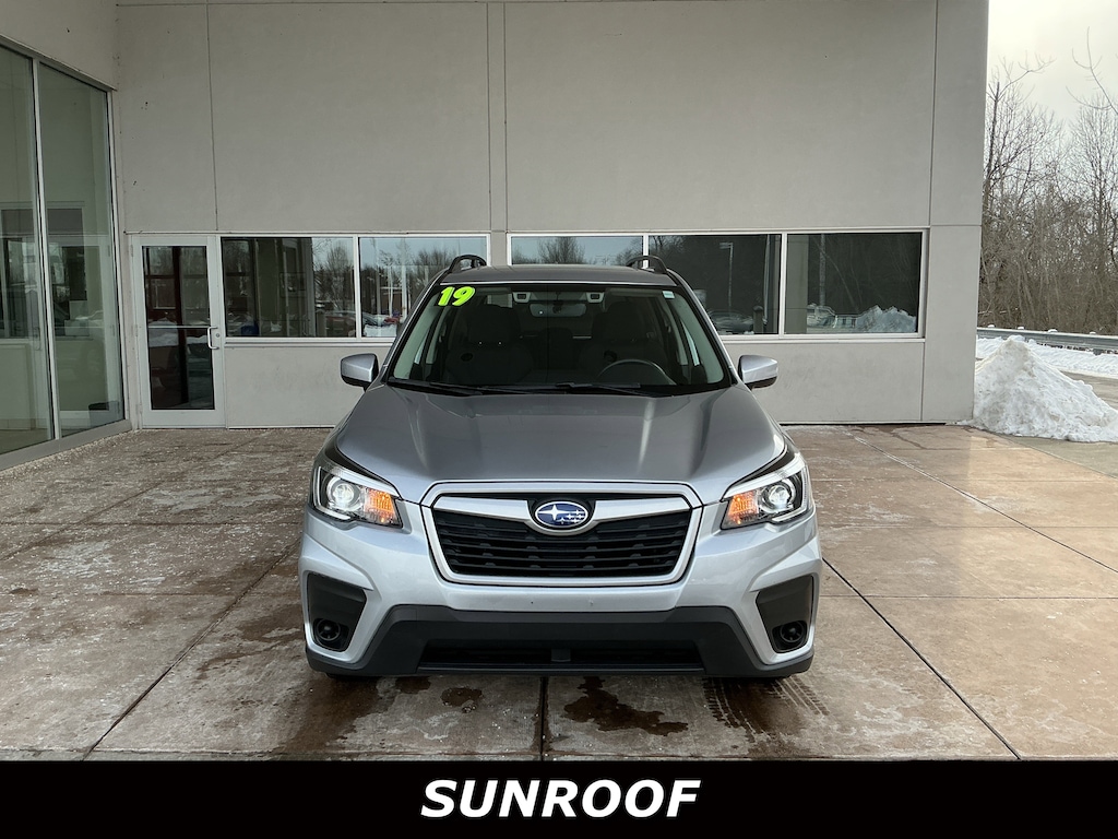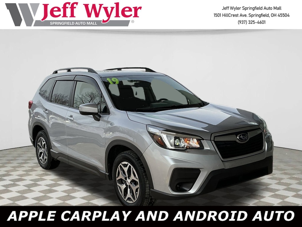 Jeff Wyler Springfield Auto Mall is proud to offer this superb-looking 2019 Subaru Forester Premium in Ice Silver Metallic. Well equipped with: All-Weather Pkg & BSD & Keyless Acc & Pwr Rr Gate (Blind Spot Detection w/Rear Cross Traffic Alert, Heated Exterior Mirrors, Heated Front Seats, Keyless Access w/Push-Button Start, Power Rear Gate, and Windshield Wiper De-Icer), Popular Package #1 (All-Weather Floor Liners, Auto-Dimming Exterior Mirror w/Approach Lighting, Auto-Dimming Mirror w/Compass & HomeLink, Cargo Tray, and Rear Bumper Cover), 3.70 Axle Ratio, 4-Wheel Disc Brakes, 6 Speakers, ABS brakes, Air Conditioning, Alloy wheels, AM/FM radio: SiriusXM, Automatic temperature control, Brake assist, Bumpers: body-color, CD player, Cloth Upholstery, Driver door bin, Driver vanity mirror, Dual front impact airbags, Dual front side impact airbags, Electronic Stability Control, Emergency communication system: STARLINK Safety and Security, Exterior Parking Camera Rear, Four wheel independent suspension, Front anti-roll bar, Front Bucket Seats, Front Center Armrest, Front reading lights, Fully automatic headlights, Illuminated entry, Knee airbag, Low tire pressure warning, Occupant sensing airbag, Outside temperature display, Overhead airbag, Overhead console, Panic alarm, Passenger door bin, Passenger vanity mirror, Power door mirrors, Power driver seat, Power moonroof: Panoramic, Power steering, Power windows, Radio data system, Radio: Subaru Starlink 6.5" Multimedia Plus System, Rear anti-roll bar, Rear seat center armrest, Rear Seatback Protector, Rear window defroster, Rear window wiper, Remote keyless entry, Roof rack: rails only, Security system, Speed control, Speed-sensing steering, Split folding rear seat, Spoiler, STARLINK/Apple CarPlay/Android Auto, Steering wheel mounted audio controls, Tachometer, Telescoping steering wheel, Tilt steering wheel, Traction control, Trip computer, Variably intermittent wipers, and Wheels: 17" x 7.0J Black Machine Finish Alloy. Awards: * 2019 KBB.com 12 Best Family Cars * 2019 KBB.com 10 Best SUVs Under $30,000 * 2019 KBB.com 10 Best All-Wheel-Drive Vehicles Under $30,000 * 2019 KBB.com Brand Image Awards * 2019 KBB.com 5-Year Cost to Own Awards Ask about available certifications. Used vehicles 10 years of age or newer with less than 100,000 miles are eligible for the Wyler Assurance Program, but eligible vehicles must pass our reconditioning process and multi-point inspection. Provided the vehicle passes inspection, vehicles will be eligible for the 6 month/6,000 mile limited warranty. The 6 month/6,000 mile limited warranty is NOT available on AS-IS vehicles, wholesale vehicles, lease buyback/pass-thru vehicles or un-inspected vehicles. Note that this program can also apply to vehicles where the remaining factory coverage is less than 6 months or 6,000 miles. Please check the Federal Trade Commission (FTC) Buyers guide on the vehicle for full details as to whether or not warranty coverage may apply. Contact Dealer for additional details. The Wyler Assurance 6 month/6,000 Mile limited warranty ends 6 months from the date of the Retail Purchase Agreement (BUYERS ORDER) or when the vehicle's odometer registers 6,000 additional miles to the mileage listed on the BUYERS ORDER, whichever comes first. Your Deductible - The warranty holder on your contract pays the first $100 of each covered repair.