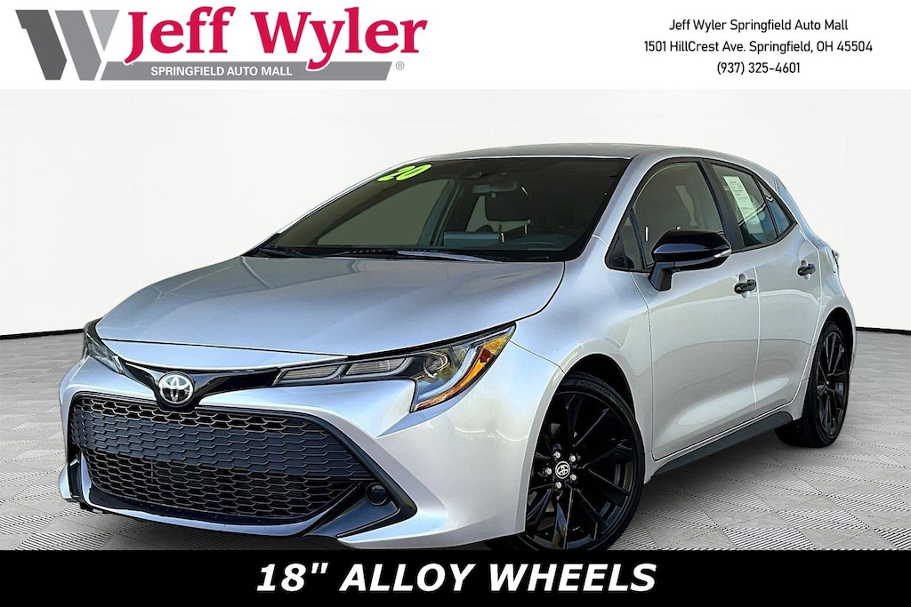 Jeff Wyler Springfield Auto Mall is delighted to offer this good-looking 2020 Toyota Corolla Hatchback SE Nightshade Edition in Classic Silver Metallic. Well equipped with: 4-Wheel Disc Brakes, 6 Speakers, ABS brakes, Air Conditioning, Alloy wheels, AM/FM radio: SiriusXM, Apple CarPlay/Android Auto, Auto High-beam Headlights, Automatic temperature control, Brake assist, Bumpers: body-color, Compass, Delay-off headlights, Driver door bin, Driver vanity mirror, Dual front impact airbags, Dual front side impact airbags, Electronic Stability Control, Emergency communication system: Safety Connect with 1-year trial, Exterior Parking Camera Rear, Fabric Upholstery, Four wheel independent suspension, Front anti-roll bar, Front Bucket Seats, Front Center Armrest, Front reading lights, Heated door mirrors, Illuminated entry, Knee airbag, Leather Shift Knob, Low tire pressure warning, Occupant sensing airbag, Outside temperature display, Overhead airbag, Overhead console, Panic alarm, Passenger door bin, Passenger vanity mirror, Power door mirrors, Power steering, Power windows, Radio data system, Radio: Audio AM/FM, Rear anti-roll bar, Rear seat center armrest, Rear window defroster, Rear window wiper, Remote keyless entry, Security system, Speed control, Speed-sensing steering, Split folding rear seat, Spoiler, Sport Front Seats, Steering wheel mounted audio controls, Tachometer, Telescoping steering wheel, Tilt steering wheel, Traction control, Trip computer, Turn signal indicator mirrors, and Variably intermittent wipers. Ask about available certifications. Used vehicles 10 years of age or newer with less than 100,000 miles are eligible for the Wyler Assurance Program, but eligible vehicles must pass our reconditioning process and multi-point inspection. Provided the vehicle passes inspection, vehicles will be eligible for the 6 month/6,000 mile limited warranty. The 6 month/6,000 mile limited warranty is NOT available on AS-IS vehicles, wholesale vehicles, lease buyback/pass-thru vehicles or un-inspected vehicles. Note that this program can also apply to vehicles where the remaining factory coverage is less than 6 months or 6,000 miles. Please check the Federal Trade Commission (FTC) Buyers guide on the vehicle for full details as to whether or not warranty coverage may apply. Contact Dealer for additional details. The Wyler Assurance 6 month/6,000 Mile limited warranty ends 6 months from the date of the Retail Purchase Agreement (BUYERS ORDER) or when the vehicle's odometer registers 6,000 additional miles to the mileage listed on the BUYERS ORDER, whichever comes first. Your Deductible - The warranty holder on your contract pays the first $100 of each covered repair.