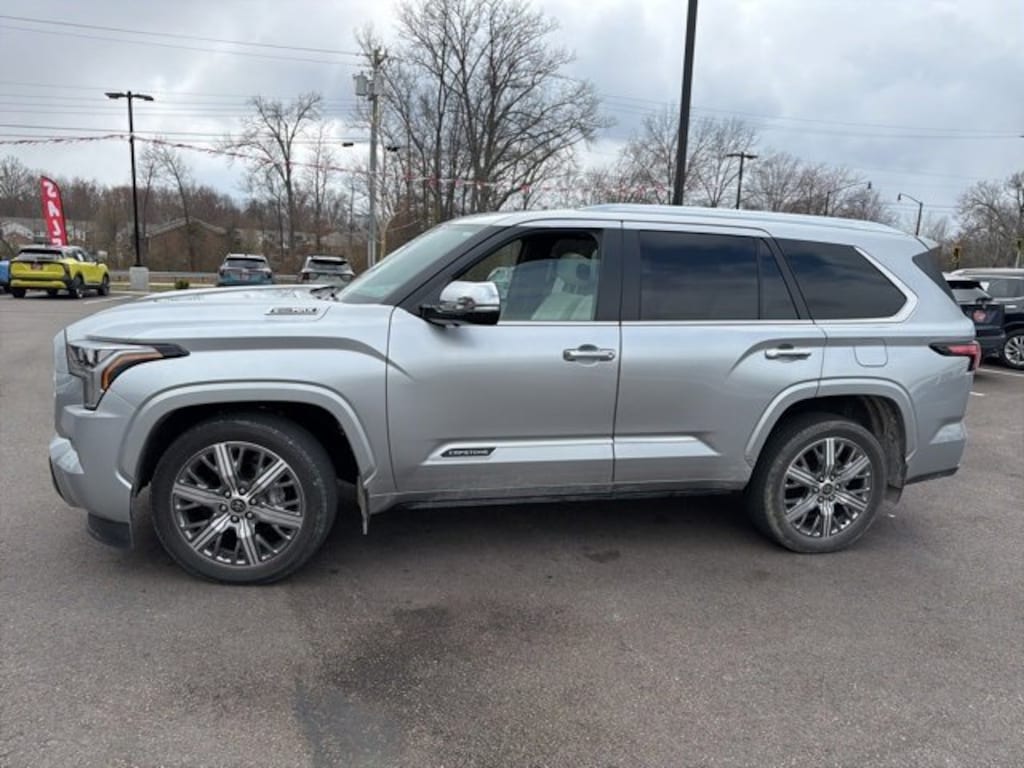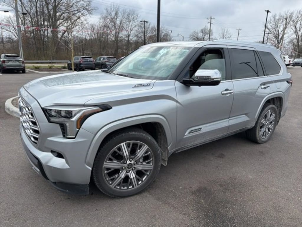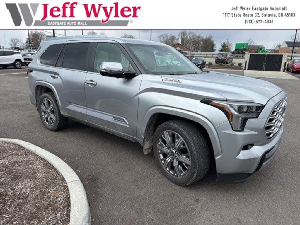 Jeff Wyler Eastgate Auto Mall is delighted to offer this good-looking 2024 Toyota Sequoia in Silver. Well equipped with: 3.31 Axle Ratio, 3rd row seats: split-bench, 4-Wheel Disc Brakes, ABS brakes, Air Conditioning, Alloy wheels, AM/FM radio: SiriusXM, Anti-whiplash front head restraints, Apple CarPlay/Android Auto, Auto High-beam Headlights, Auto-dimming door mirrors, Auto-dimming Rear-View mirror, Automatic temperature control, Brake assist, Bumpers: body-color, Delay-off headlights, Driver door bin, Driver vanity mirror, Dual front impact airbags, Dual front side impact airbags, Electronic Stability Control, Emergency communication system: Safety Connect (10-year trial), Exterior Parking Camera Rear, Front anti-roll bar, Front Bucket Seats, Front Center Armrest w/Storage, Front dual zone A/C, Front fog lights, Front reading lights, Front wheel independent suspension, Fully automatic headlights, Headlight cleaning, Heated door mirrors, Heated front seats, Illuminated entry, Knee airbag, Leather steering wheel, Low tire pressure warning, Occupant sensing airbag, Outside temperature display, Overhead airbag, Overhead console, Panic alarm, Passenger door bin, Passenger vanity mirror, Power door mirrors, Power driver seat, Power moonroof, Power passenger seat, Power steering, Power windows, Rear air conditioning, Rear reading lights, Rear seat center armrest, Rear window defroster, Rear window wiper, Reclining 3rd row seat, Remote keyless entry, Security system, Speed control, Speed-sensing steering, Split folding rear seat, Spoiler, Steering wheel mounted audio controls, Tachometer, Telescoping steering wheel, Tilt steering wheel, Traction control, Trip computer, Turn signal indicator mirrors, Variably intermittent wipers, and Voltmeter. Ask about available certifications. Used vehicles 10 years of age or newer with less than 100,000 miles are eligible for the Wyler Assurance Program, but eligible vehicles must pass our reconditioning process and multi-point inspection. Provided the vehicle passes inspection, vehicles will be eligible for the 6 month/6,000 mile limited warranty. The 6 month/6,000 mile limited warranty is NOT available on AS-IS vehicles, wholesale vehicles, lease buyback/pass-thru vehicles or un-inspected vehicles. Note that this program can also apply to vehicles where the remaining factory coverage is less than 6 months or 6,000 miles. Please check the Federal Trade Commission (FTC) Buyers guide on the vehicle for full details as to whether or not warranty coverage may apply. Contact Dealer for additional details. The Wyler Assurance 6 month/6,000 Mile limited warranty ends 6 months from the date of the Retail Purchase Agreement (BUYERS ORDER) or when the vehicle's odometer registers 6,000 additional miles to the mileage listed on the BUYERS ORDER, whichever comes first. Your Deductible - The warranty holder on your contract pays the first $100 of each covered repair.